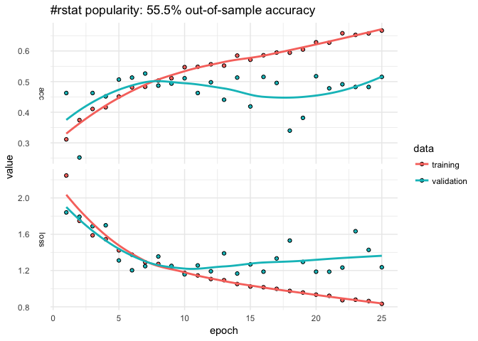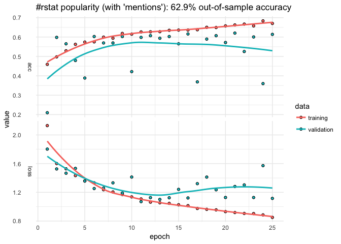Let’s start with a dense neural net, the default of kms. We can use base R functions to help clean the data–in this case, cut to discretize the outcome, grepl to look for key words, and weekdays and format to capture different aspects of the time the tweet was posted.
