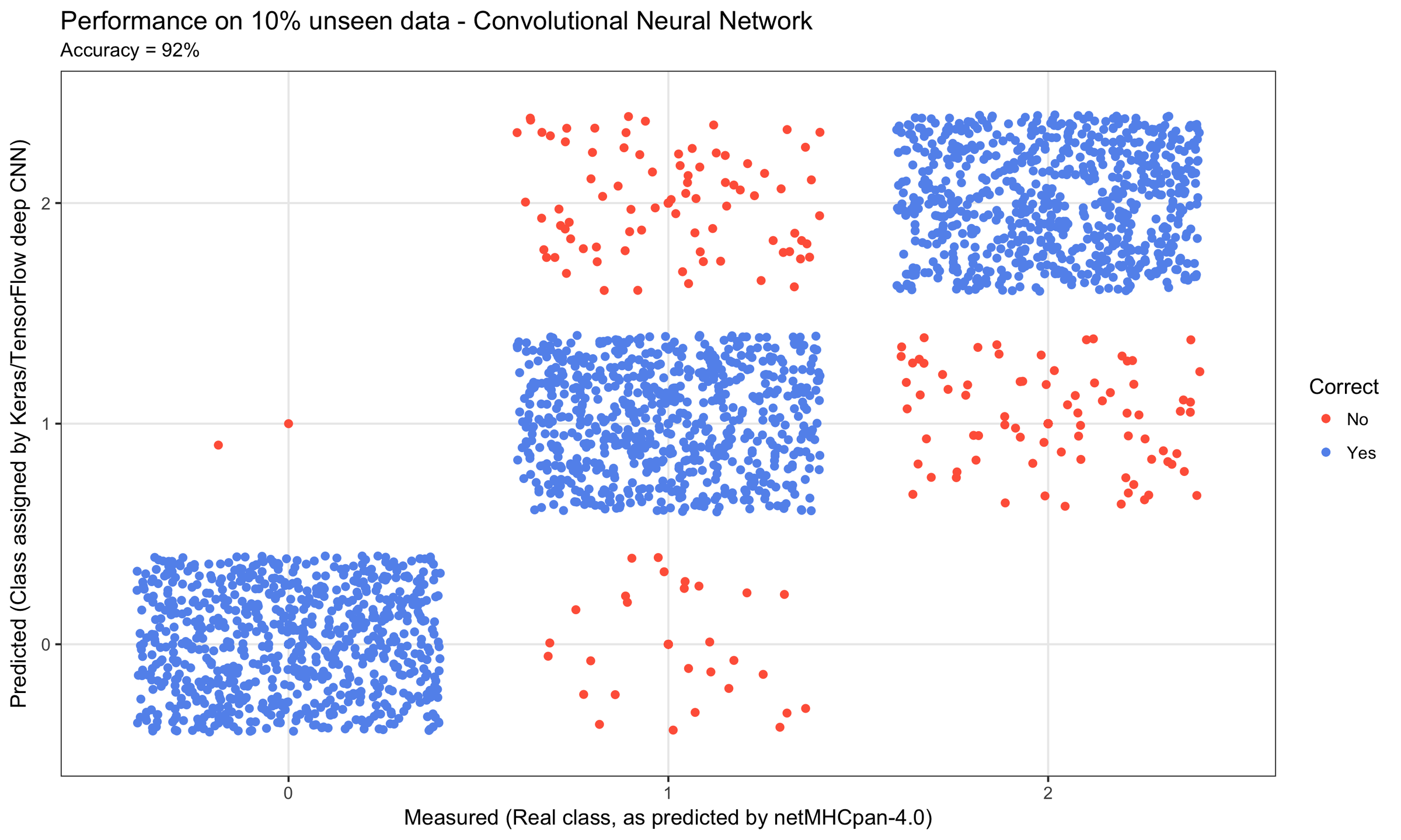 One might have expected the CNN to be able to better capture the information in the peptide ‘images’. There is however a crucial difference between the peptide ‘images’ and the e.g. MNIST dataset. The peptide ‘images’ do not contain edges and spatially arranged continuous structures, rather they are a set of pixels with p2 always at p2 and likewise for p9, which are determinants for binding.