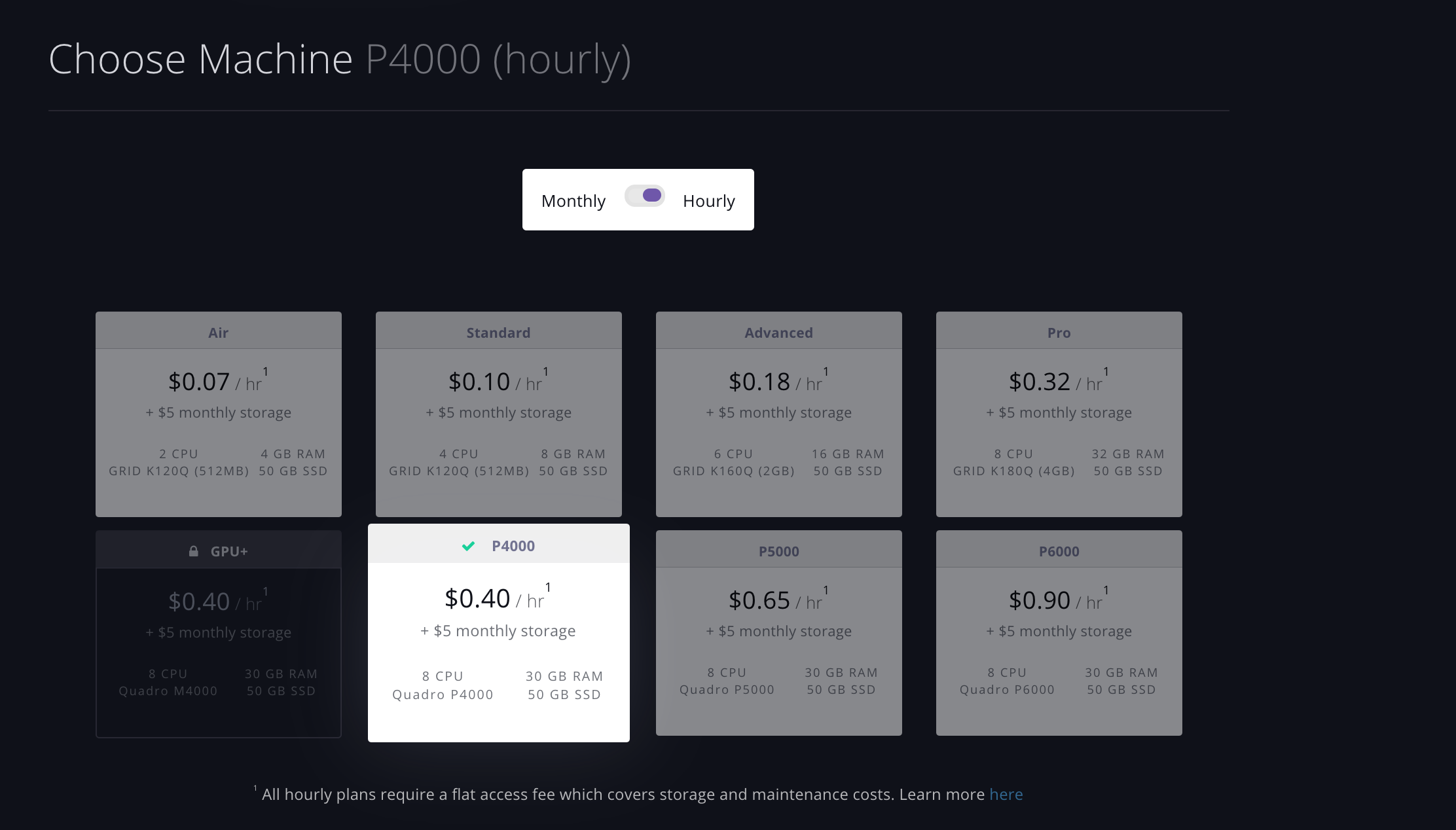 Then, choose one of the Paperspace GPU instances (as opposed to the CPU instances). For example, here we select the P4000 machine type which includes an NVIDIA Quadro P4000 GPU: