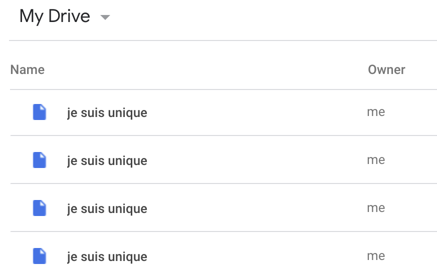 Google Drive doesn’t impose a 1-to-1 relationship between files and filepaths, the way your local file system does. Therefore, when working via the Drive API (instead of in the browser), it’s fairly easy to create multiple Drive files with the same name or filepath, without actually meaning to. This is perfectly valid on Drive, which identifies file by ID, but can be confusing and undesirable for humans. Very few people actually want this: