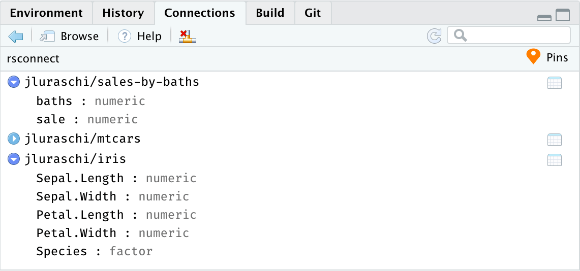 pin("sales-by-baths", board = "rsconnect")After a pin is published, you can then browse to the pin’s content from the RStudio Connect web interface.