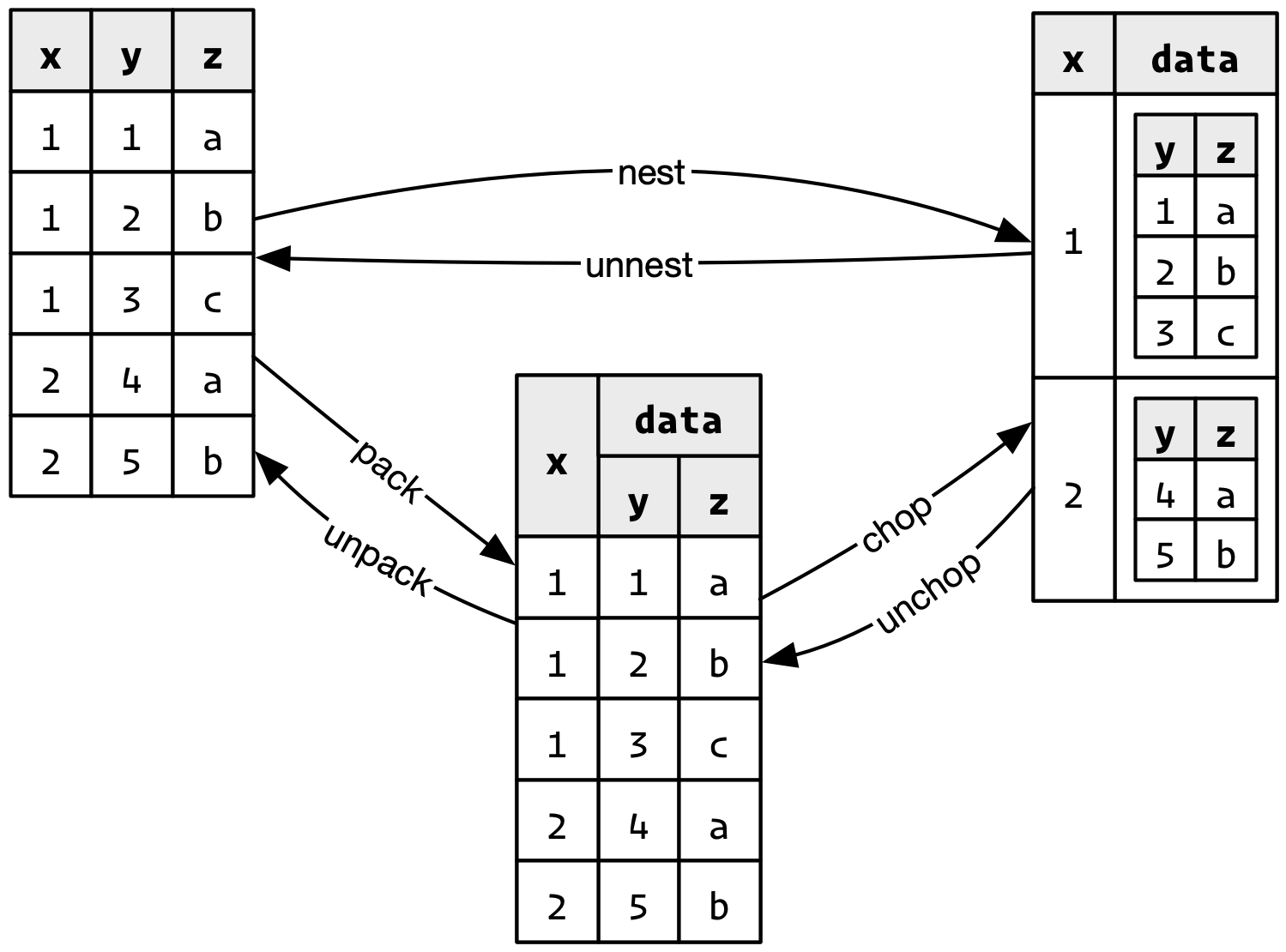 chop()andunchop()chop up rows into and out of list-columns. It’s a bit like an explicit form ofdplyr::group_by().