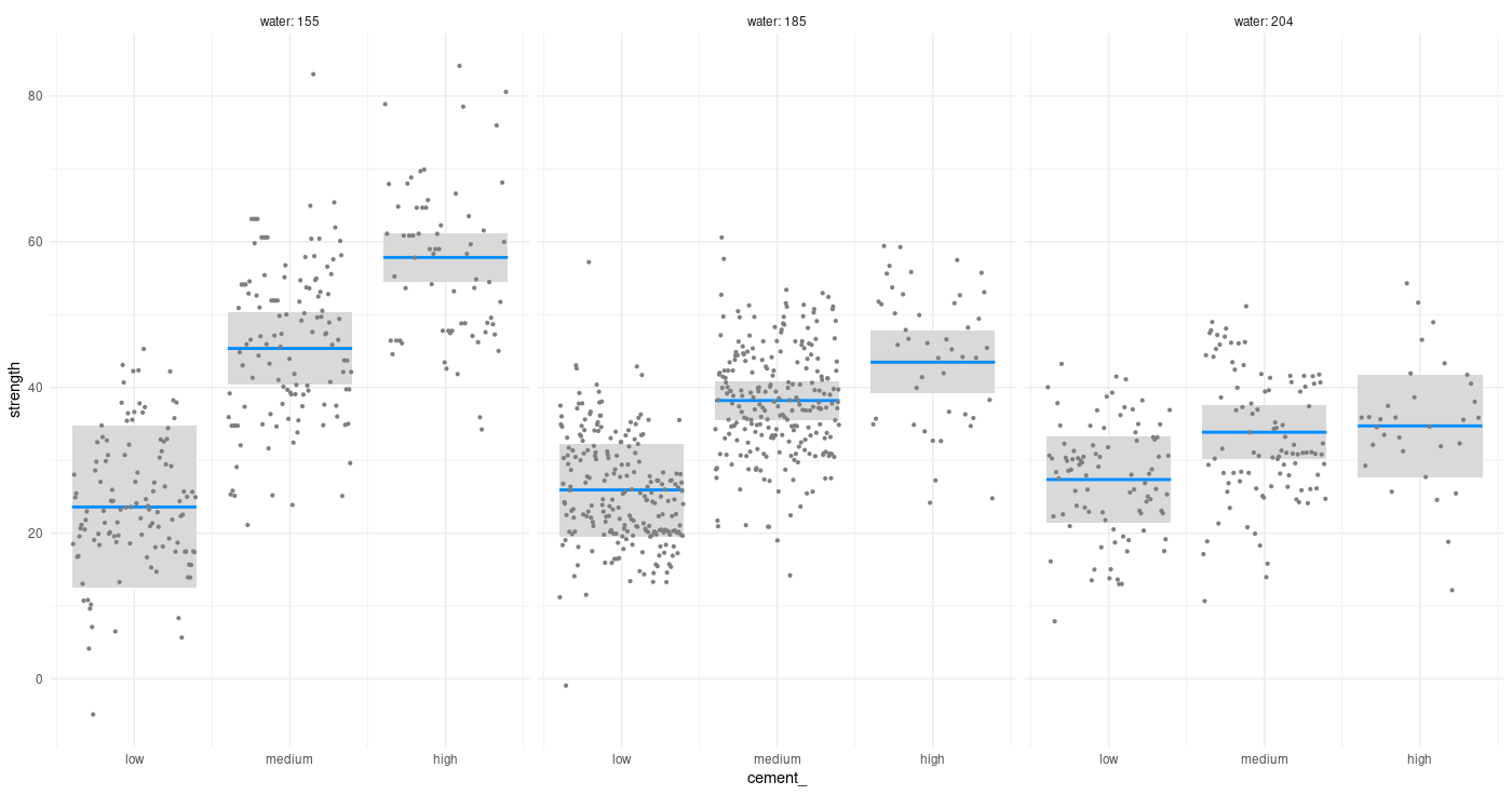 Checking for a possible interaction (one that a layperson could easily think of), does cement concentration act differently on concrete strength depending on how much water there is in the mixture?