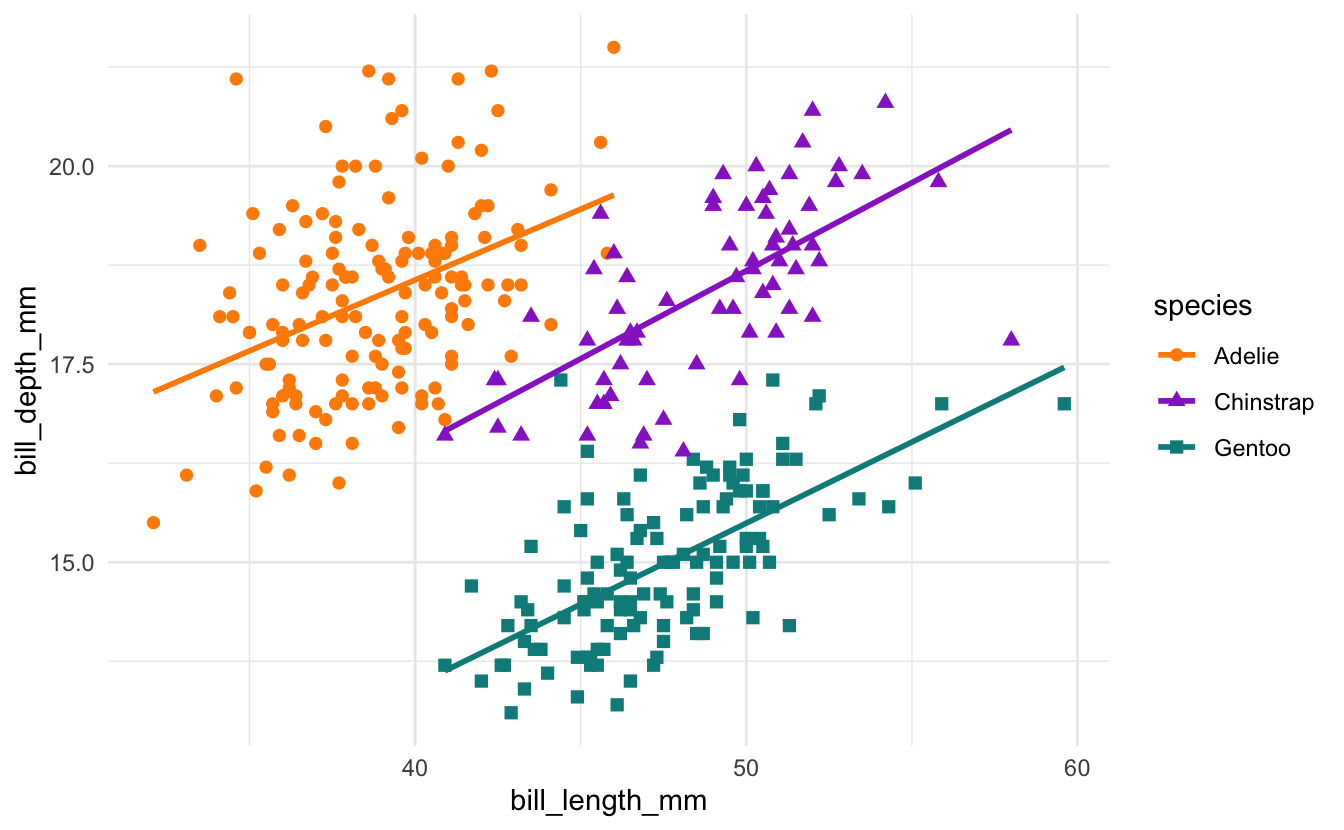 But, if you look at the correlations within species, bill length and depth are actually positive correlated. This is a nice “in the wild” example of Simpson’s paradox .