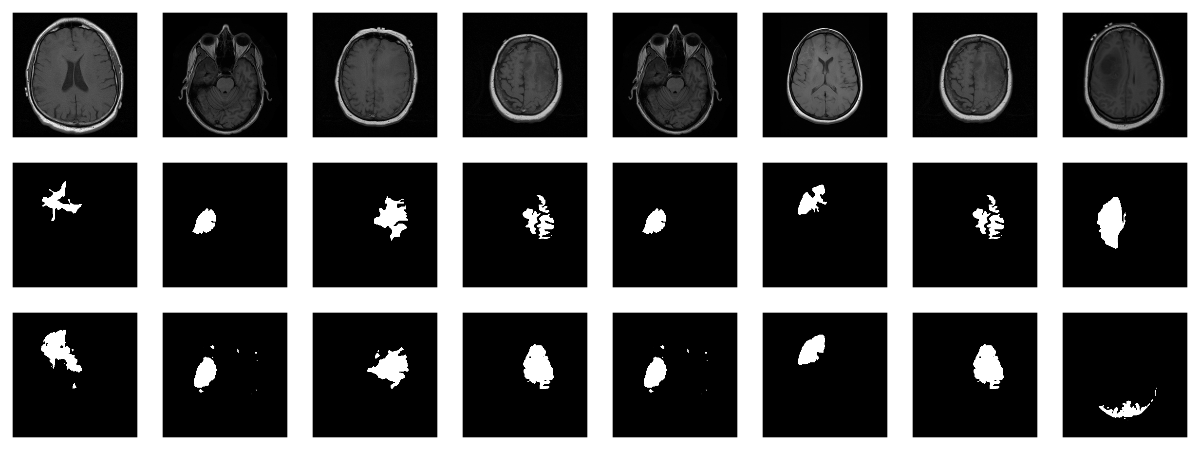 Now, since we don’t have a separate test set, we already know the average out-of-sample metrics; but in the end, what we care about are the generated masks. Let’s view some, displaying ground truth and MRI scans for comparison.