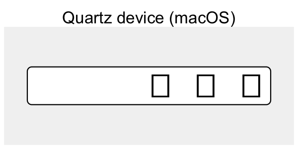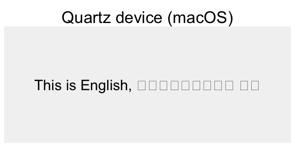 The Cairo device on Linux handles this task well, as we have noted above. How come this works, but only on one OS? Cairo is built in to most Linux distributions and is designed to work with Pango, the library that linux uses to layout text. R’s Cairo graphics device bundles Cairo on all platforms, but doesn’t include Pango, due to the challenges of building it on other operating systems.