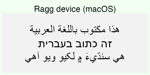 If you’re not familiar with the languages above it can be hard to see what is right and what is wrong. You may, however, look at how the text in the code is rendered in the browser and compare that to the device rendering. If you do that, you can see that the Hebrew script is rendered in the wrong direction for all the non-ragg devices (except Cairo on Linux). For the Arabic and Sindhi it’s even harder to see what’s wrong because the text looks fundamentally different. That’s because both Arabic and Sindhi rely extensively on text substitution rules and ligatures; the way a letter is written depends critically on what letters it is next to. Still, by comparing to the browser rendering you can see that the same devices failing on the Hebrew script fail here as well.