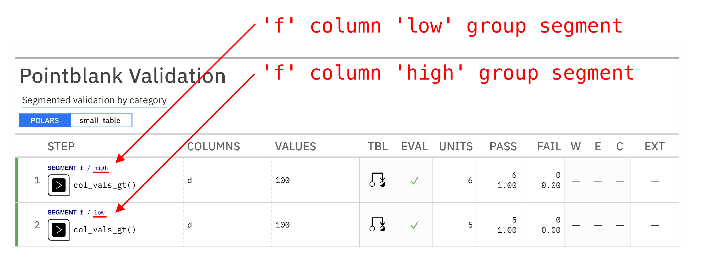 Here’s a screenshot of a validation report with two validation steps, one for each segment ("low" and "high") in the f column of the small_table dataset.