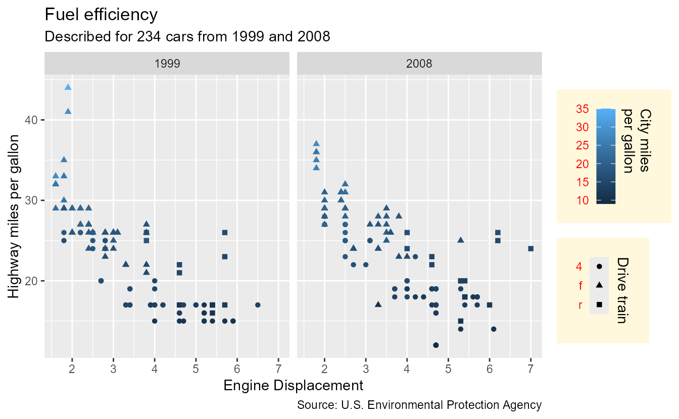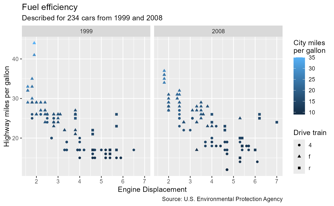 p <- ggplot(mpg, aes(displ, hwy, colour = cty, shape = drv)) +
